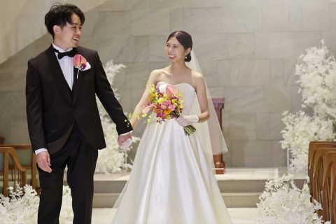 挙式は自分たちの言葉でみんなに誓いをしたいと思い人前式にしました。成婚宣言はゲスト全員にしてもらい、家族・友人、たくさんの方に支えられているのだと実感しました。待ち時間からゲストが楽しめるよう、会場に写真やアルバム、ユニフォームなど思い出の品をいっぱい飾りました。ブーケトス&サッカーボールトス(笑)も無事決まり、披露宴がスタート。会場は「夏」をモチーフにいっぱいの向日葵を飾り、爽やかな雰囲気の中入場しました。新郎フランベによるタコさんウインナーをゲストに食べてもらったり、スタッフの方によるダミー入場でゲストを驚かせたり、常にゲストを楽しませる演出を考えました。両親への感謝の気持ちも忘れません。挙式は両親と共に入場、生い立ちムービーを一緒に見て、最後は生まれ年のワインと花束をプレゼント。両親の笑顔と涙を見て、本当に育ててくれてありがとうと心から思いました。結婚式のプランナーを親友に担当してもらい、たくさんわがままも聞いてもらいました。僕らも準備期間から式当日までとても楽しく、ブルーブランの皆さんのおかげだと思っています。ここで式を挙げられて本当によかった。ありがとうブルーブラン!!